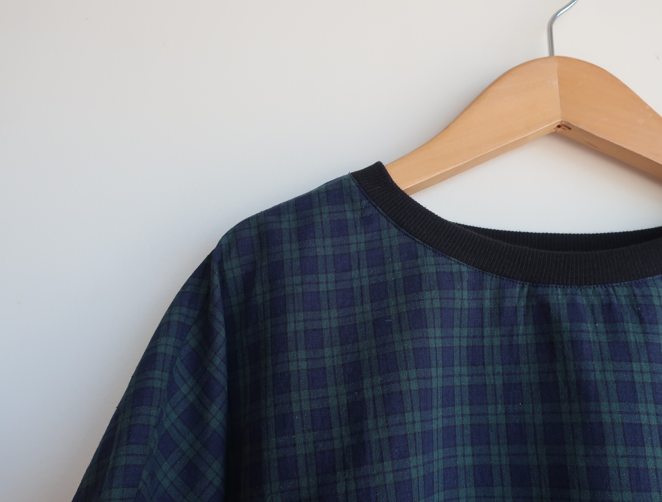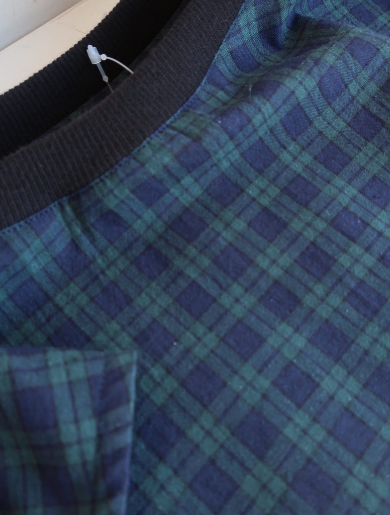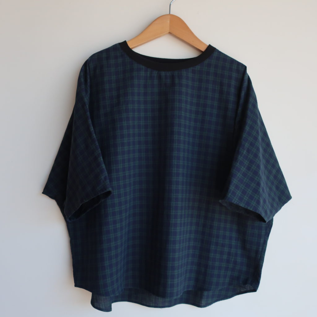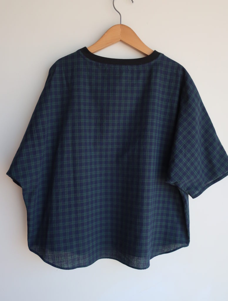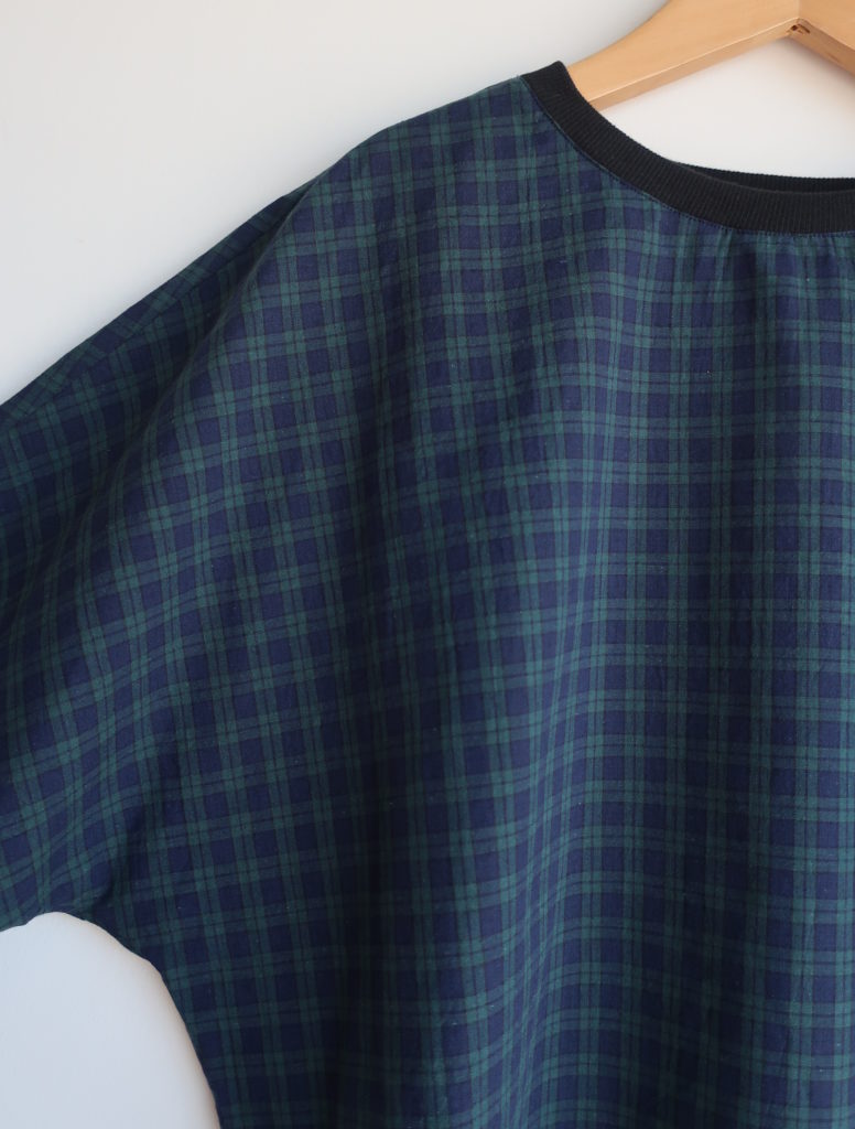 Parkes 綿麻チェッククルーネックプルオーバー5分袖 2026.04.11 11,000円(税込12,100円) col.ネイビー系 綿67% 麻33% 幅63cm 丈60-62.5cm made in Japan PH2621007 ご注文