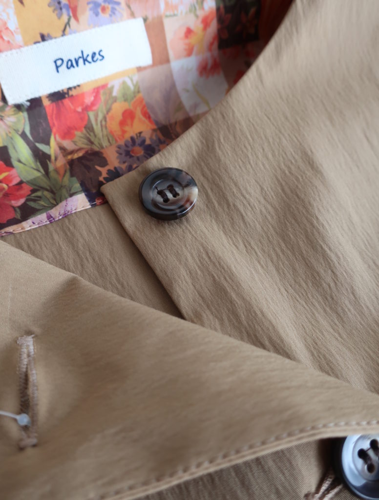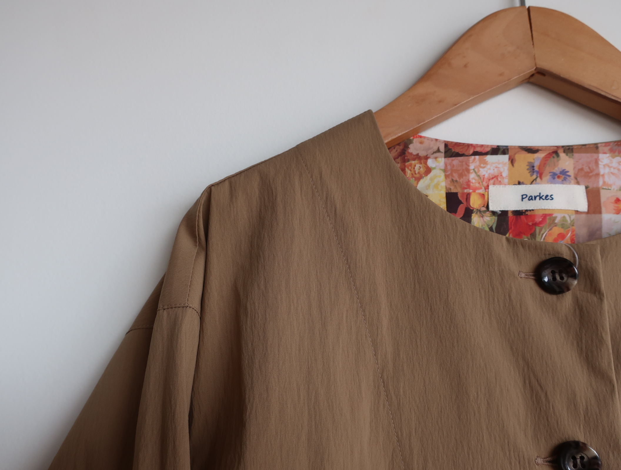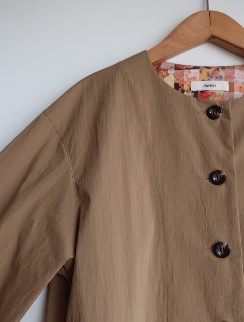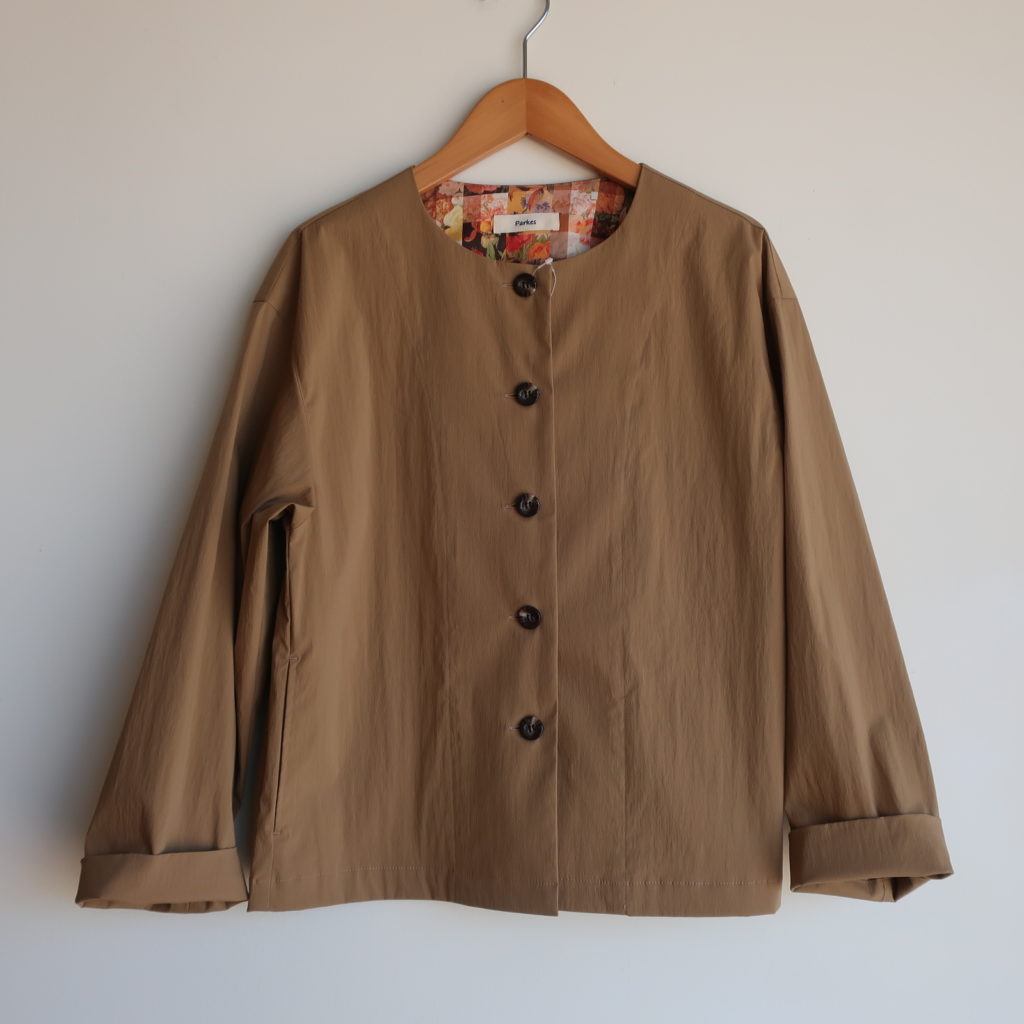 Parkes C/Nタイプライターノーカラージャケット(sold out) 2025.08.142025.10.06 15,000円(税込16,500円) col.キャメルsold 綿63% ナイロン32% ポリウレタン5% 幅49cm 丈56cm PJ2531018 ご注文