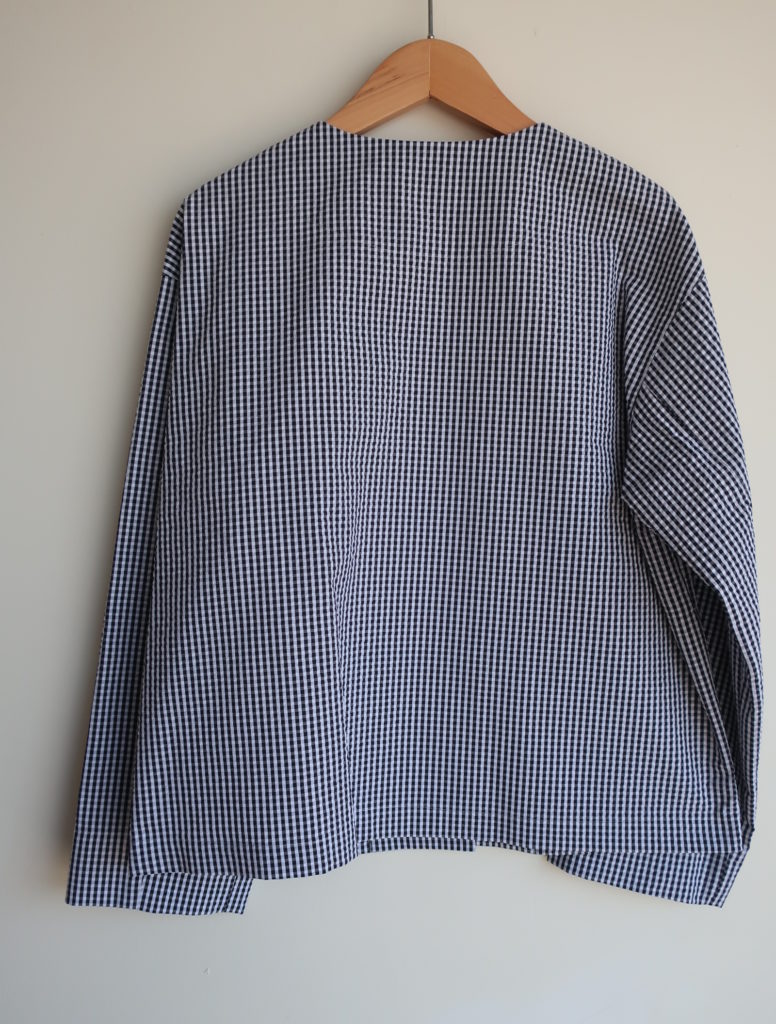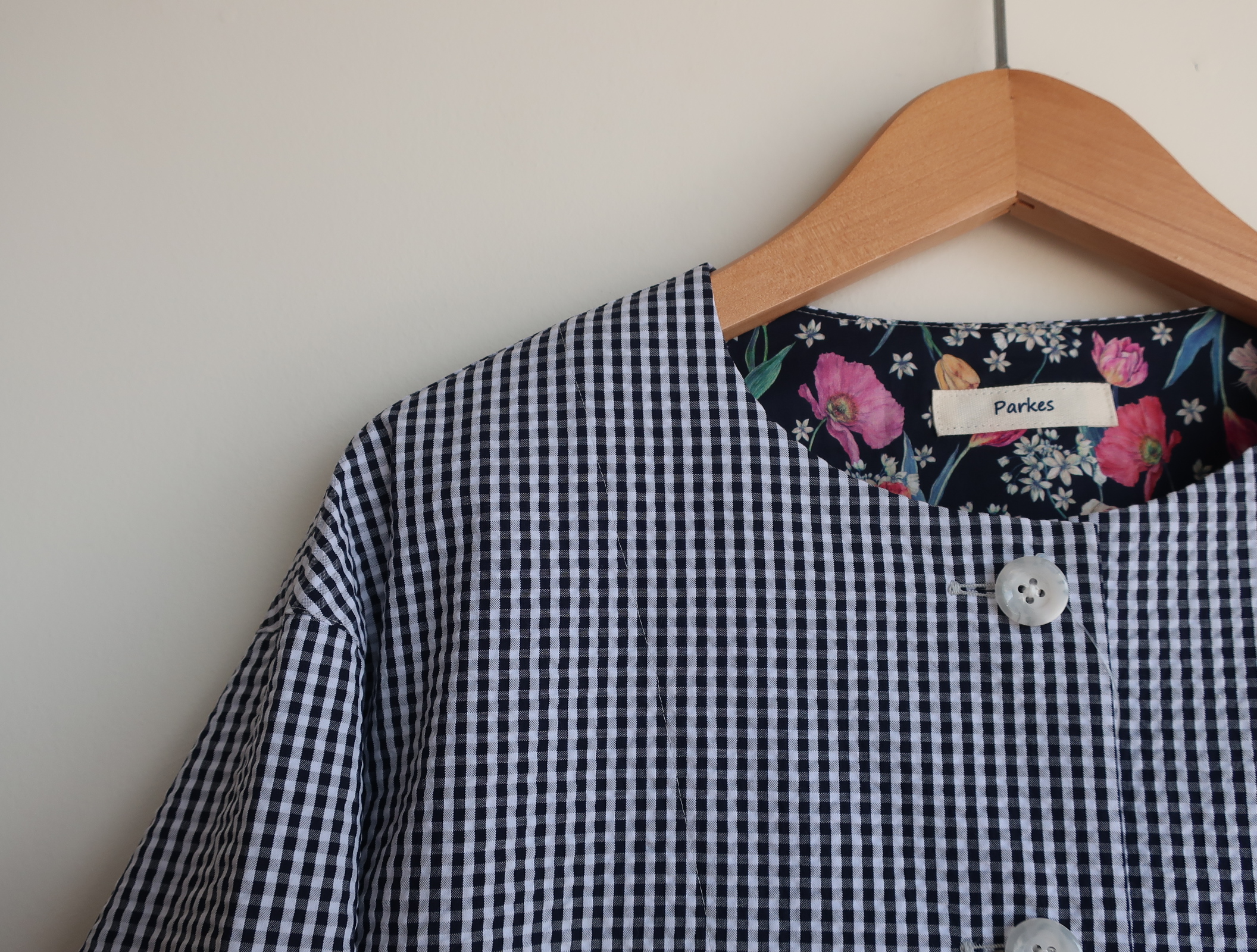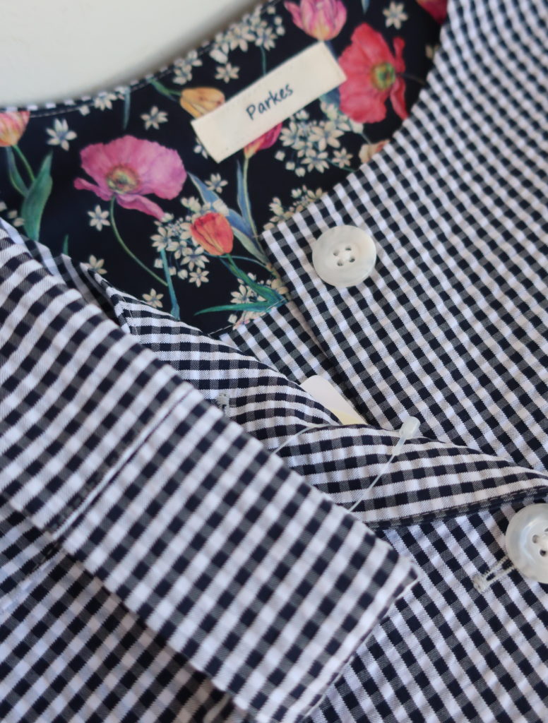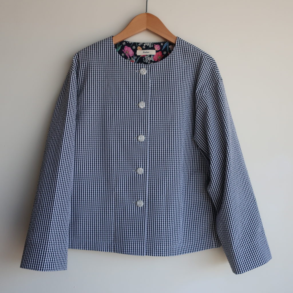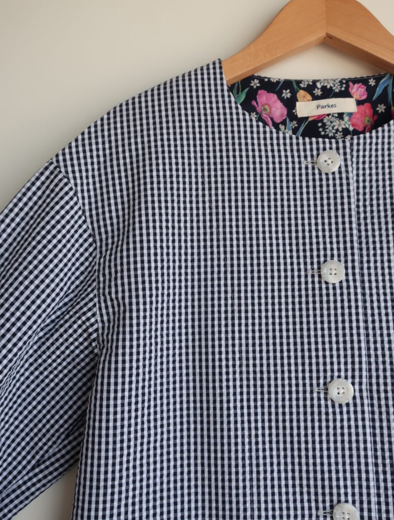 Parkes コットンポリサッカーノーカラージャケット 2026.03.13 15,000円(税込16,500円) col.ギンガム 綿76% ポリエステル24% 幅50cm 丈57cm made in Japan ご注文