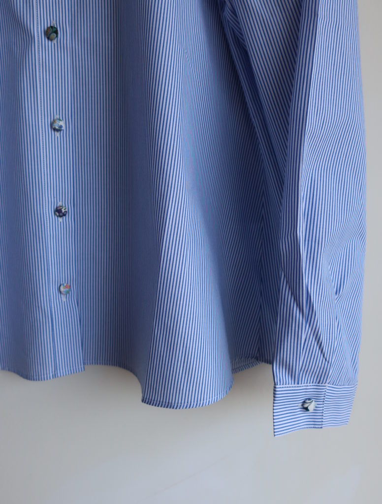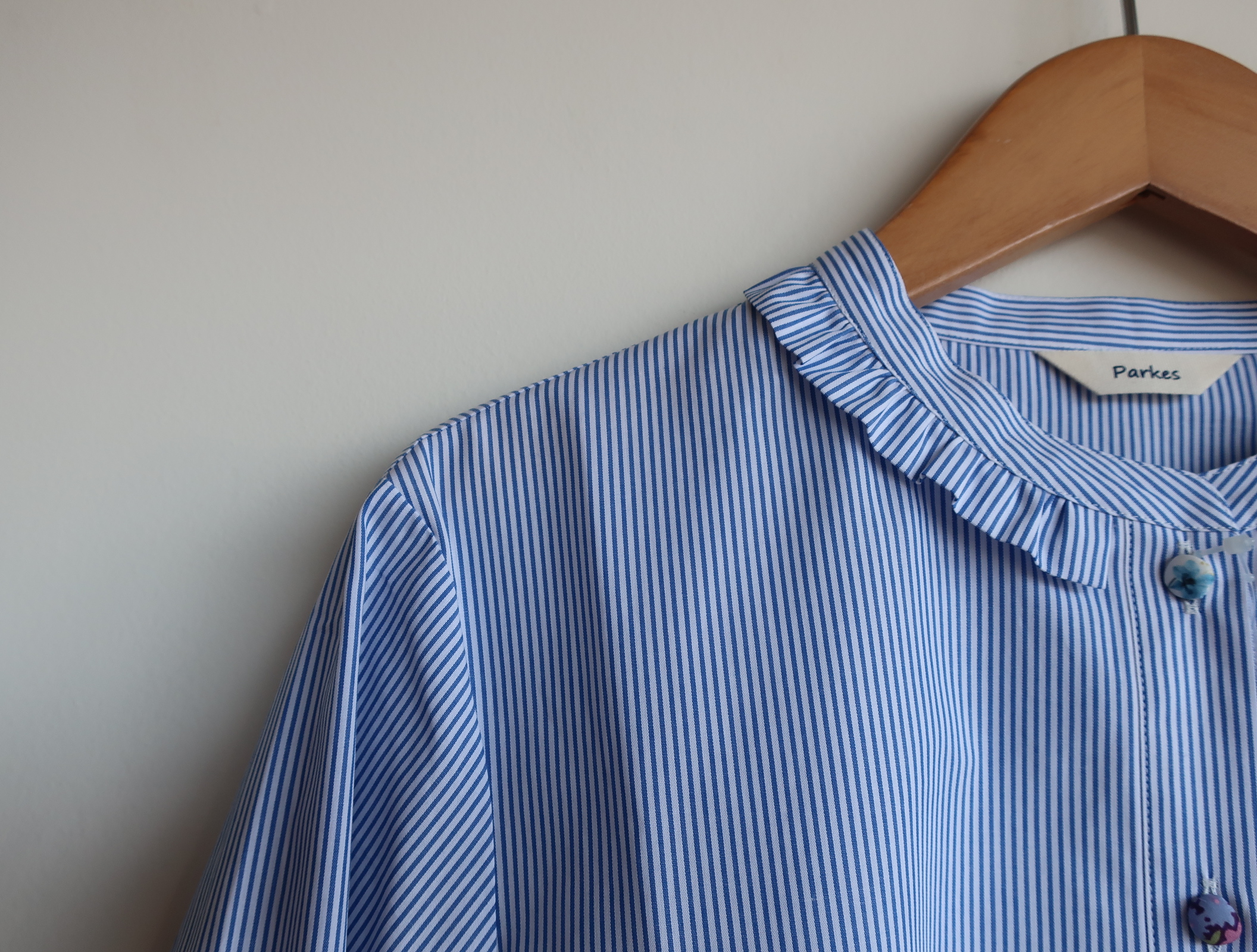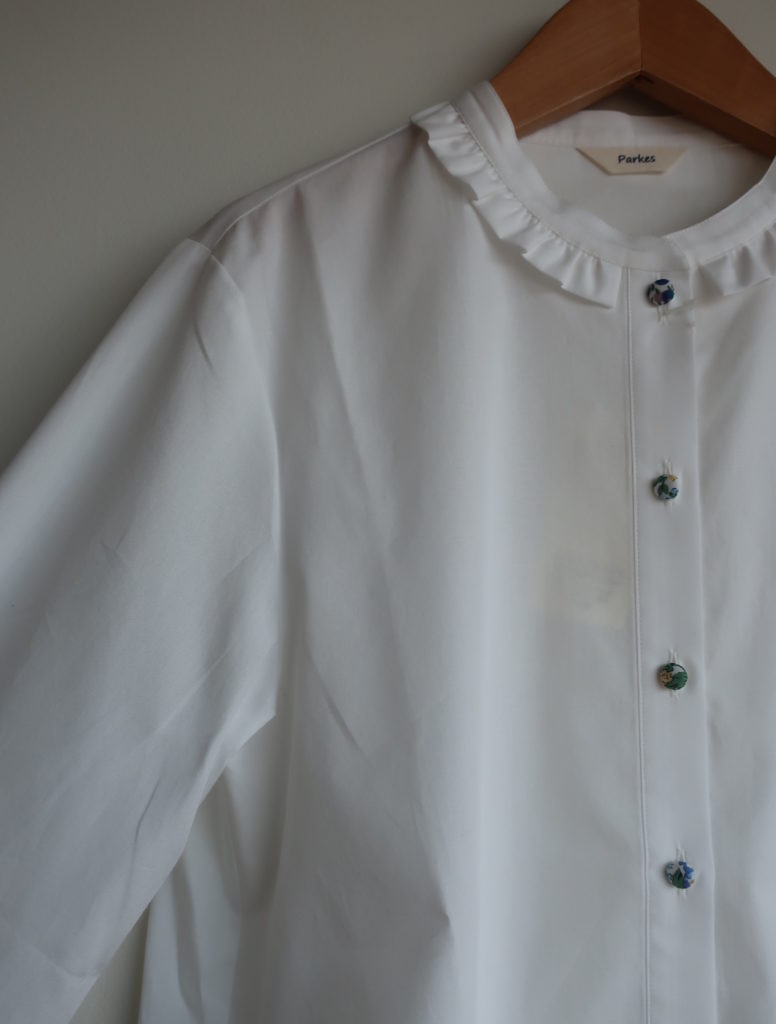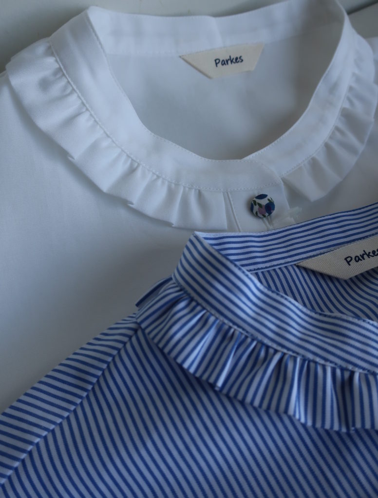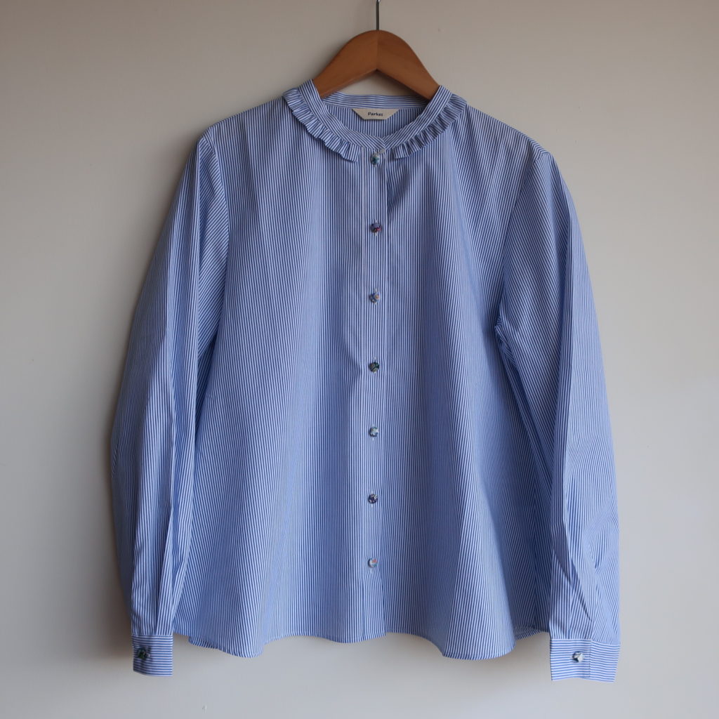 Parkes ブロードリバティくるみボタンフリル付ブラウス 2026.02.012026.02.04 オフ ストライプ 11,000円(税込12,100円) col.オフ/ストライプ 綿100% 幅47cm 丈62cm made in Japan PN2611035 ご注文