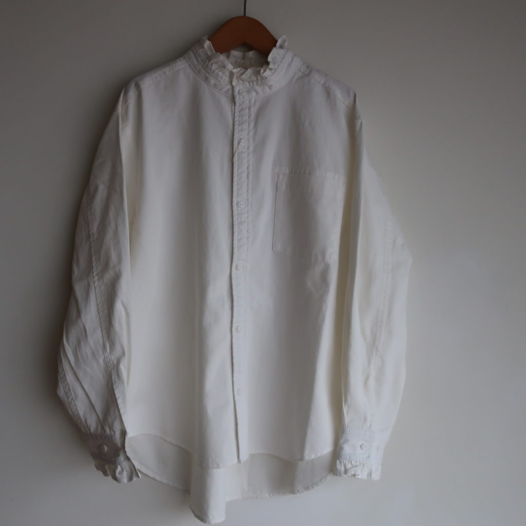 TANG フリルネックデニムシャツ 2025.11.022025.12.23 ホワイト インディゴネイビー 14,500円(税込15,950円) col.ホワイトsold/インディゴネイビー 綿100% 幅55cm 丈66-73cm 2325606 ご注文